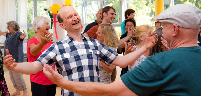 Das Lachen beginnen wir als eine Übung in einer Gruppe. Durch den Blickkontakt und etwas kindlicher Verspieltheit wird das Lachen schnell ansteckend und